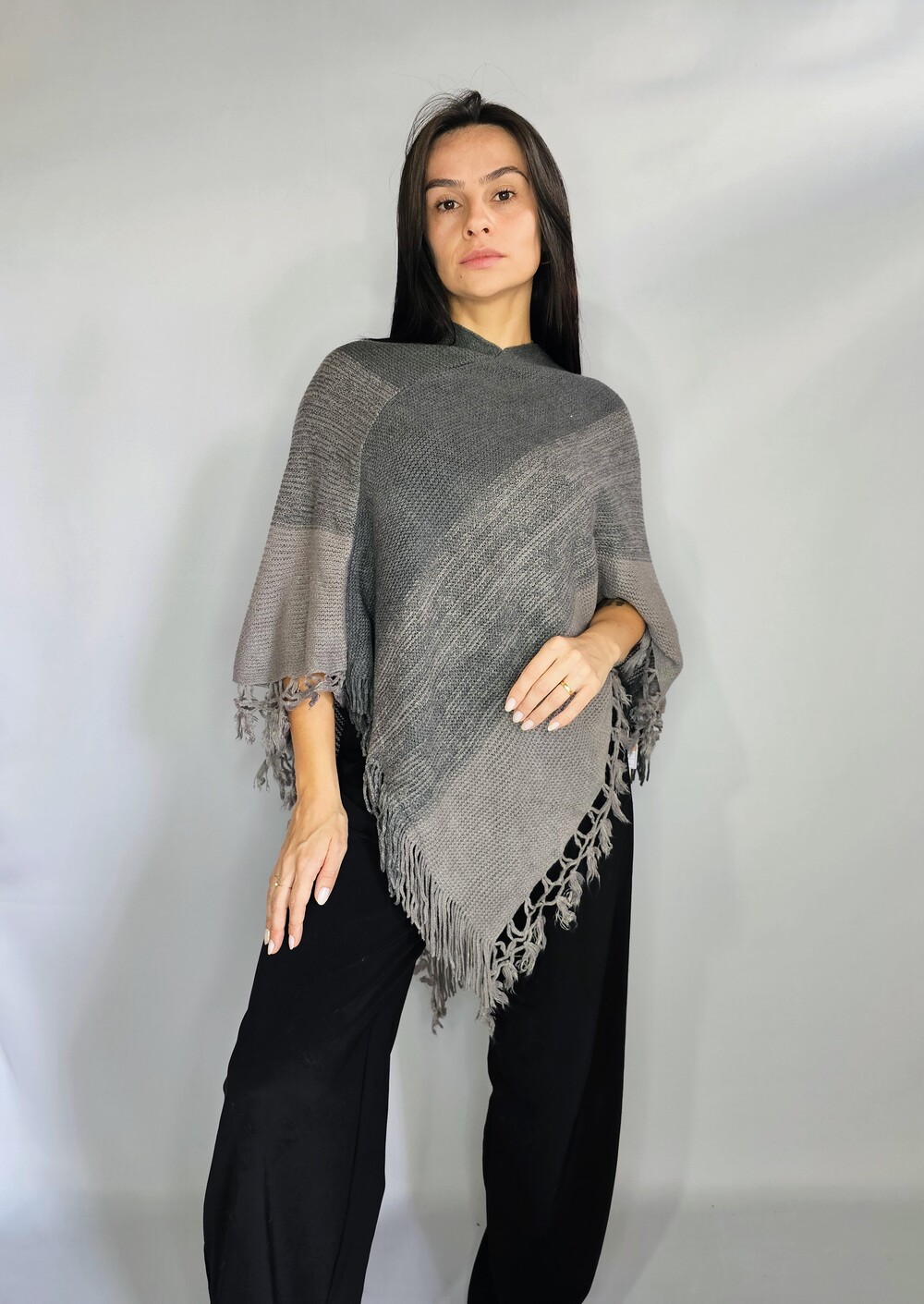 Poncho que compõe a nossa LINHA COLECTION, sua trama em fios mistos, com toque aveludado e macio, peça essencial para o seu guarda-roupa.